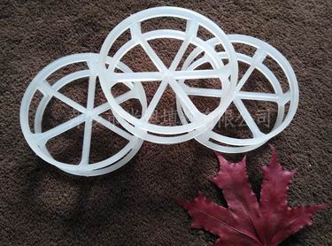 塑料扁環(huán)的高徑比為0.2-0.4,取消了階梯環(huán)的翻邊,采用內(nèi)彎弧形筋片來提高填料強(qiáng)度,在亂堆時(shí)能有序排列,流道結(jié)構(gòu)合理,壓降低,在處理能力和傳質(zhì)性能上均有所改善。