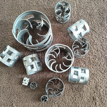 金屬鮑爾環(huán)填料是20世紀(jì)40年代德國BASF公司在拉西環(huán)填料的基礎(chǔ)上開發(fā)的,它采用金屬薄板沖扎制成,在環(huán)壁上開出了兩排帶有內(nèi)伸舌葉的窗孔,每排窗有五個(gè)舌葉彎入環(huán)內(nèi),指向環(huán)心,在中心處幾乎相搭,上下兩層窗孔的位置相互錯(cuò)開,一般開孔的總面積約為整個(gè)環(huán)面積的35%左右。由于在環(huán)壁上開了許多窗孔,使得填料層內(nèi)的氣、液分布情況及傳質(zhì)性能比拉西環(huán)有較大的改善。金屬鮑爾環(huán)填料層內(nèi)的氣體和液體分布較之拉西環(huán)有較大的改善,尤其是填料環(huán)內(nèi)表面容易被液體潤濕,使得內(nèi)表面得以充分利用。同種材質(zhì)、同樣規(guī)格的鮑爾環(huán)填料,較之拉西環(huán)不但具有較大的通過能力和較低的壓降,而且使塔的分離效率有所提高,操作彈性也有所增大。廣泛應(yīng)用于石油化工、化肥、環(huán)保等行業(yè)的填料塔中。