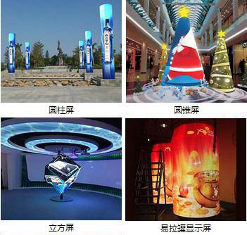 現(xiàn)已有LED企業(yè)專門研發(fā)了三角形、梯形、圓形、平行四邊形等各種異形模組,可以拼合成波浪屏、扇形屏、弧形屏、圓形屏、圓錐屏、球形屏、菱形屏、鉆石屏等各種形狀,規(guī)則或不規(guī)則的幾何圖形LED顯示屏。